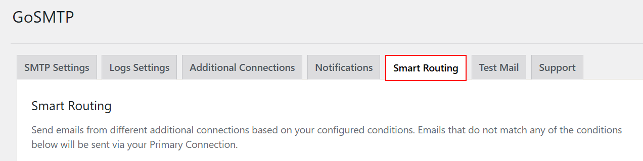 After you've added additional connection, go to GoSMTP » Settings. Then click on the Smart Routing tab.