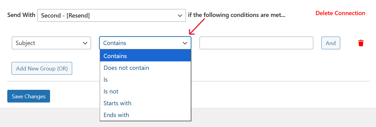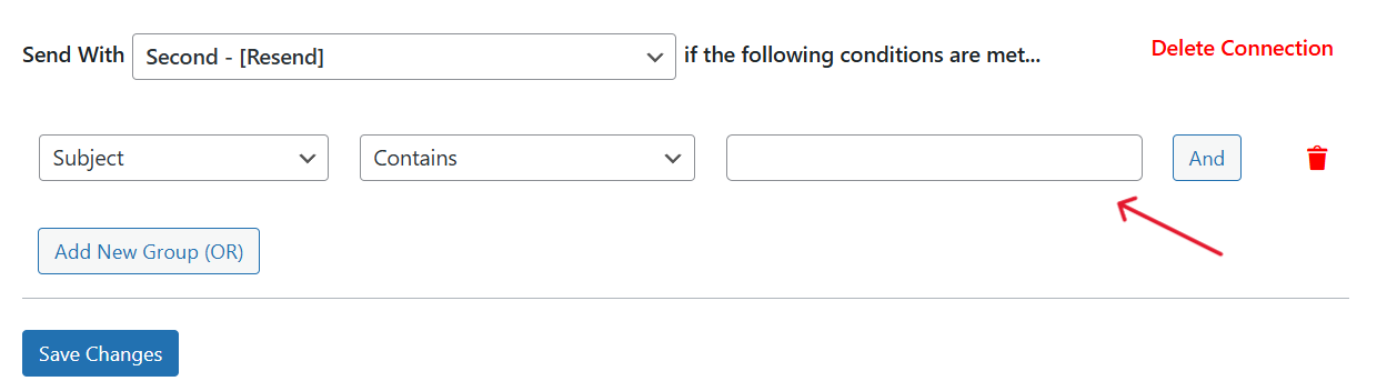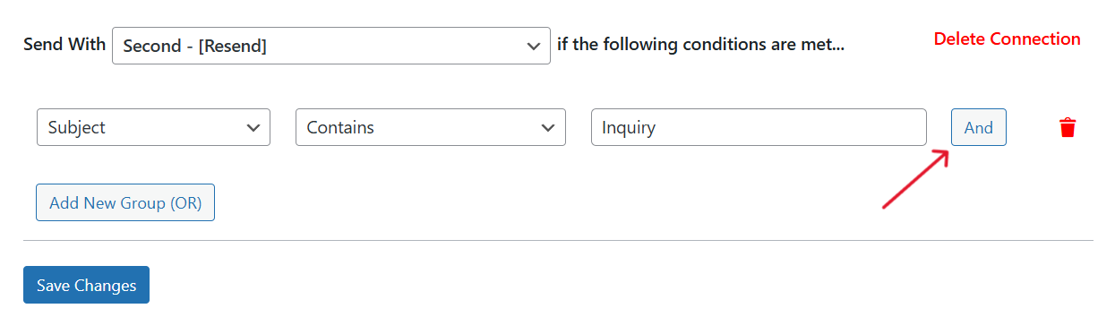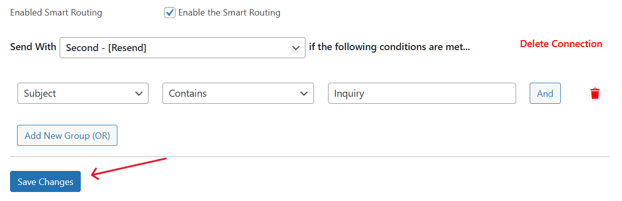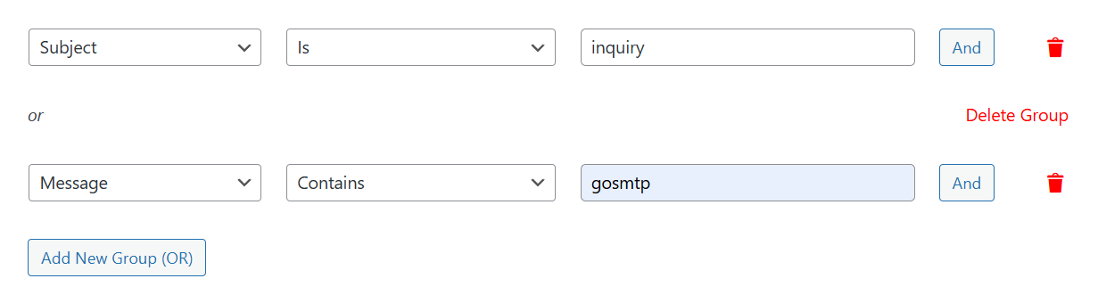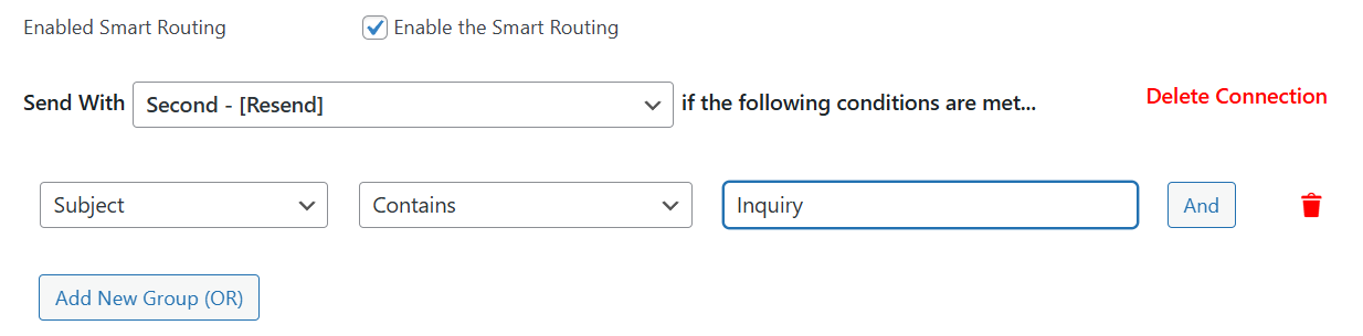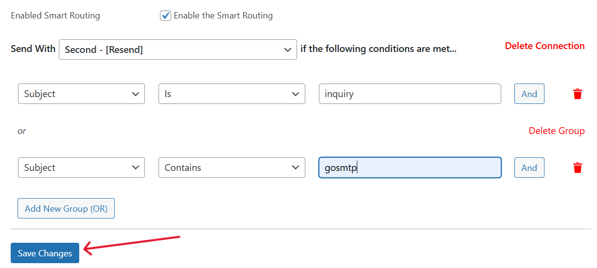 In our example, we’ve set the condition to use the resend mailer if the Subject is 'inquiry' or the Message contains the term 'gosmtp'.