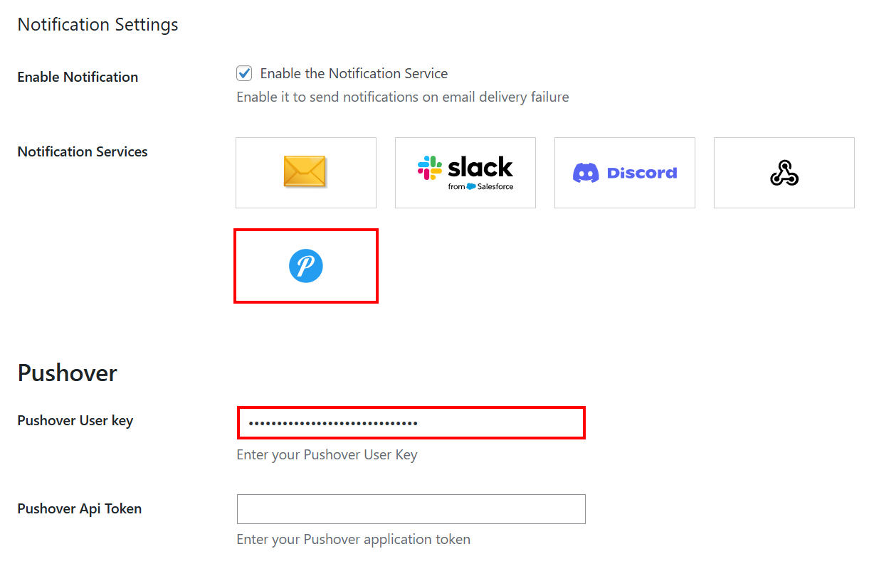 - Go to the notification tab and select Pushover from the notification service. After selecting Pushover, you will see the Pushover credentials options where you have to paste the Your User Key which you have copied.