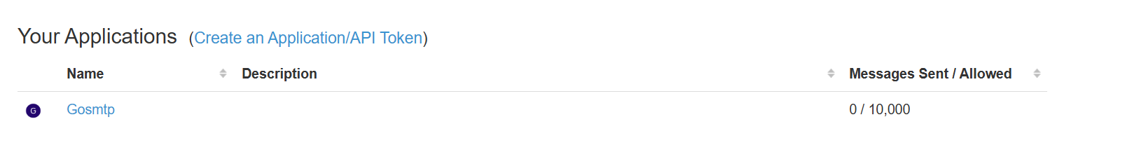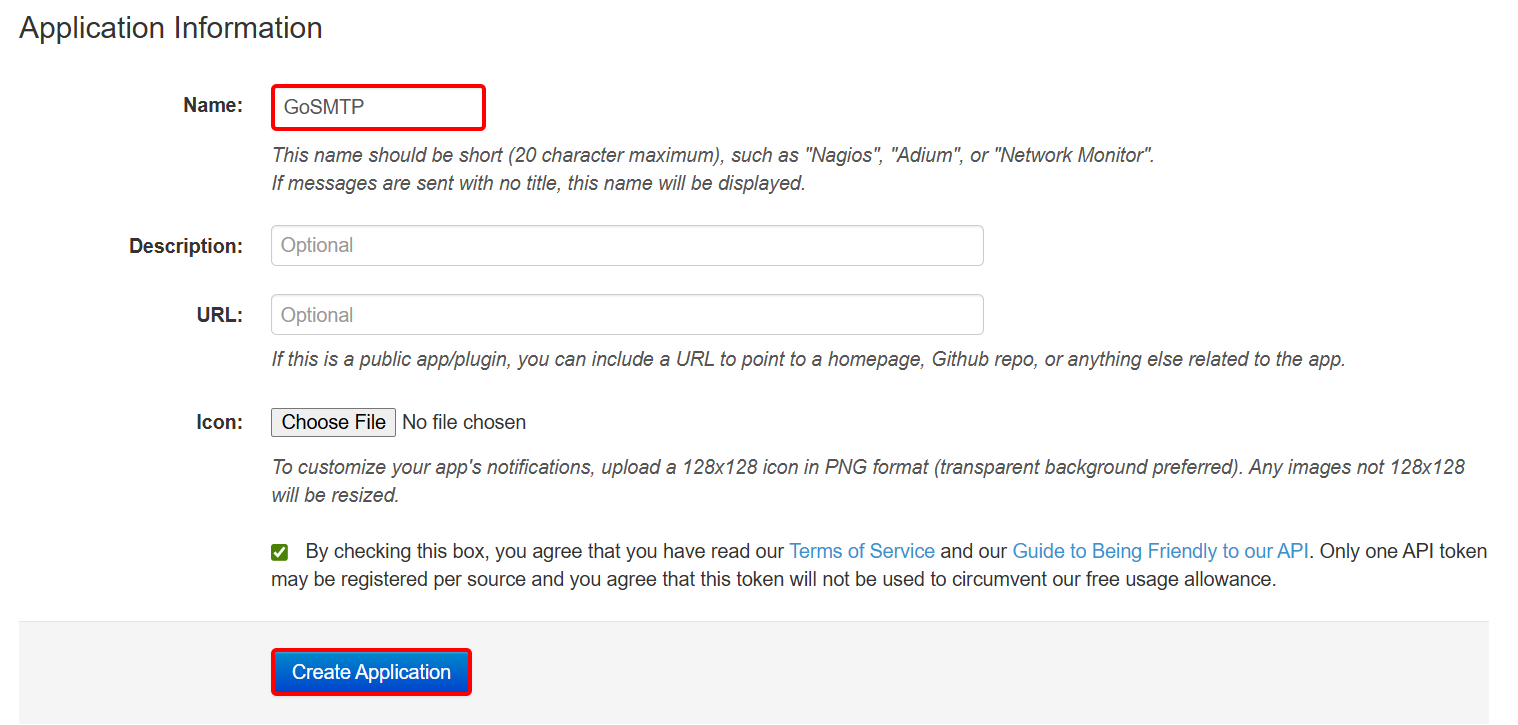 - Write GoSMTP in the name field, click on the check box and click on create Application.