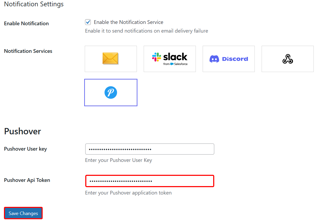 Generate these credentials from your Pushover Account and paste them into the respective fields to connect GoSMTP with Pushover, enabling you to receive an immediate alert on your Pushover app whenever a delivery failure occurs.